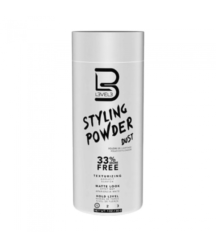 O L3VEL3 Styling Powder Light Dust é um pó de styling de 30g que proporciona um acabamento mate e fixação leve ao cabelo, sem deixar resíduos oleosos. É um produto popular para adicionar volume e textura de forma duradoura.