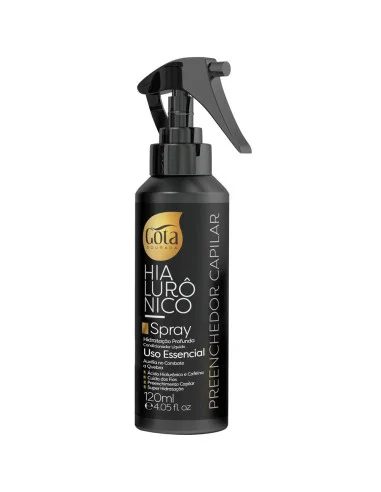 O Gota Dourada Spray Preenchedor Hialurónico 120ml é um spray condicionador líquido sem enxaguamento que trata a raiz e os fios do cabelo para combater a queda e a quebra capilar, proporcionando hidratação profunda e fortalecimento.